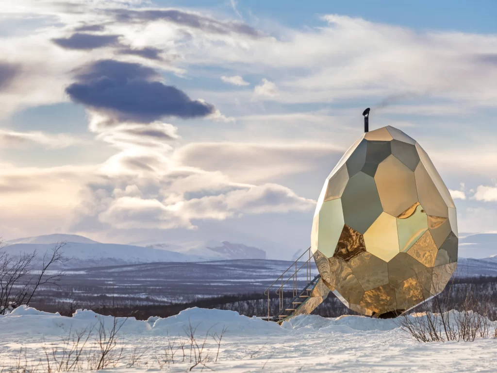Shaped like a giant golden egg, wrapped in stainless steel panels and wood interior. This sauna is another take on design and art Bigert and Bergström. Shining across a snowy landscape, its golden shine representing warmth, energy and rebirth. Resembling the whole sauna experience, rebirth, recovery, and relaxation.
