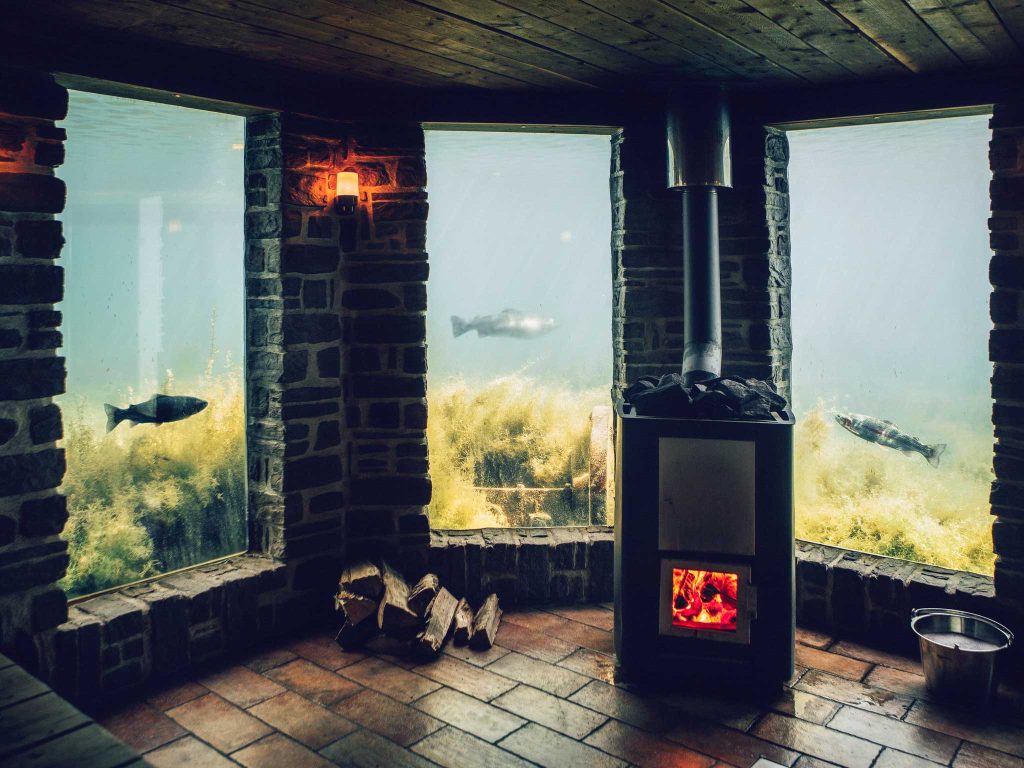 Taking things to the next level, Sweden went underwater. This underwater sauna at Astad Vingard sits partly submerged in a lake with see through panes that allows you look into the lake while sweating inside. Quite a surreal and calming experience, with the body warming up and the eyes kept cool as the views of blue water engulf the eyes.
